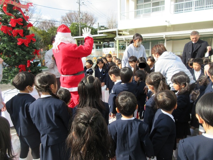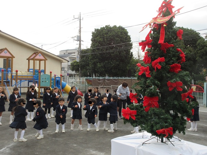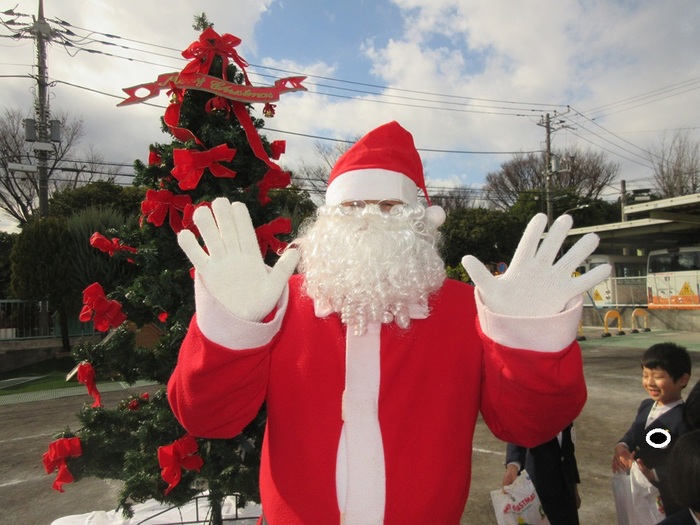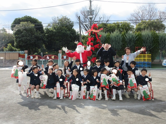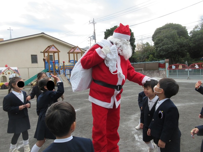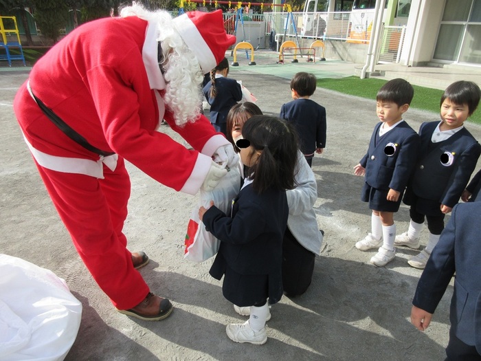 そのあとは、園庭でみんなで「やっほほーい♪」と楽しくダンスパーティー! 子ども達が「キャー!」と楽しそうに踊っていると、、、なんと、屋上からサンタさん登場!!! 大きな袋を持って、今年一年いい子にしていた子どもたちに素敵なプレゼントをたーくさん持ってきてくれました♪ 一人ひとりにプレゼントをくれたサンタさん!とっても楽しい時間を過ごすことができました❤ 二学期もたくさんのご協力をありがとうございました! 素敵な冬休みをお過ごしください♪ 三学期も元気な子どもたちに会えるのを楽しみにしています! | ||