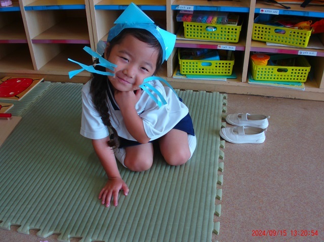 給食の後はゆっくりお部屋で遊びました。 年中さんのお部屋では自分たちで作った飾りをつけて、猫になりきって遊んでいました。 | ||