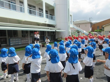 お誕生会の後は遊戯室でお楽しみ会です。今月の先生たちの出し物は音楽隊‼音楽に合わせてジャンボリーミッキーをみんなで踊りました。 | ||