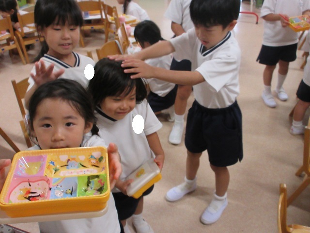 今日は給食。給食を通して色々な食材を知ったり、苦手な物にも挑戦する気持ちが持てるようになりました! 年少組のお友だちもニコニコ完食♪年長組にピカピカ給食を見せに来てくれました!年長さんはがんばった小さいお友だちの頭をなでてくれていました♡ | ||