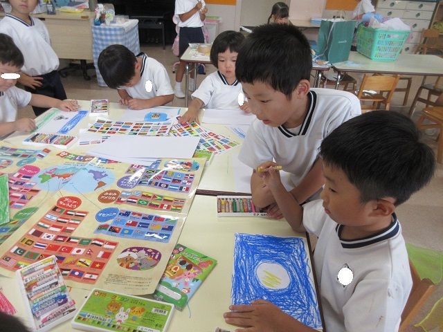 運動会にむけて、ゆり組は自由遊びの時間に万国旗を描いています。世界の国旗をみて、お気に入りの旗を何枚も完成させてお部屋に飾りました。知らない国を知る良い機会になっています。 | ||