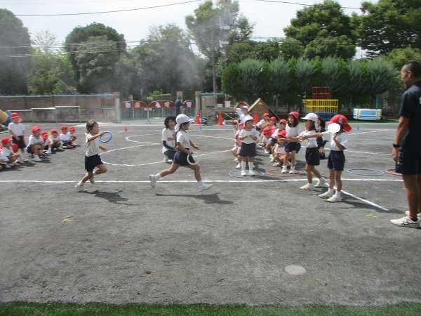 2025/9/30 運動会が終わり穏やかな秋晴れの一日。運動会の余韻を楽しみリレーをする姿がありました。 年長さんの中に年中さんも仲間入り♪一緒にリレーを楽しんでいました! | ||