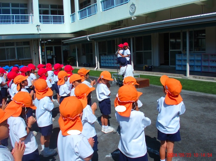 2025/9/3 幼稚園に小さいお友だちが遊びに来てくれました! 人形劇では、「はらっぱのダンス」、「おばけなんてないさ」を見ました。 みんな、興味津々で楽しんでいる姿が見られました! | ||