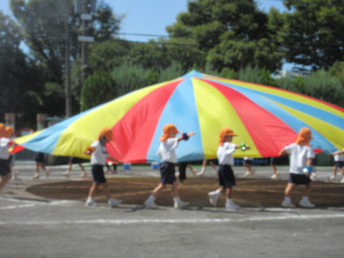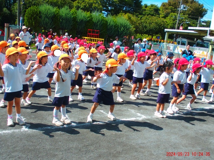 2025/9/12 今日も運動会の練習をみんなで頑張りました♪ 年少組と年中組の踊りやパラバルーンを見て、一緒に踊ったり、年長組の組体操を見て「すごいね!やってみたい!」 とキラキラした目で見ていました♪ 午後は、お外で元気いっぱいに遊んで楽しく過ごすことができました♪ | ||