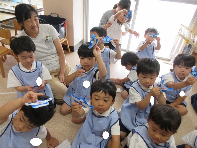 年中クラスは『とんぼロケット』の制作を一緒に楽しみました! 最後にお歌のプレゼントで『にじ』を歌いました♪ | ||