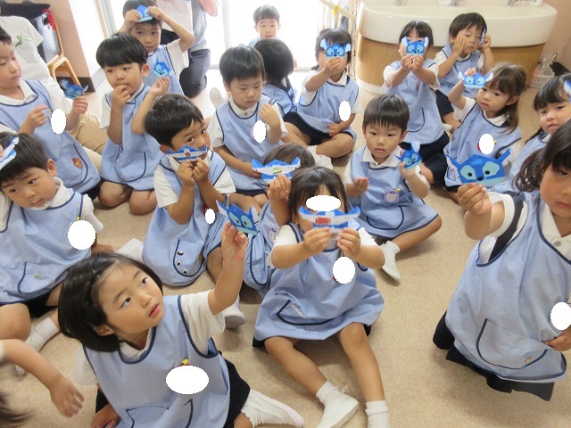 年少さんは運動会のダンスを頑張って、スティッチからお手紙とプレゼントが届きました♡ かわいいスティッチの折り紙に大喜び!スティッチと仲良くなりました♬ | ||