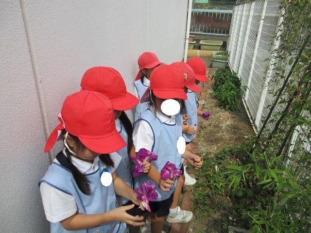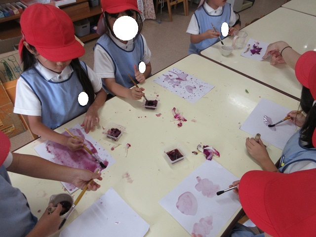 朝顔がまだまだ咲いています! 大きな花をたくさんつんで、何をする?と年長さん。 花を潰して朝顔絵の具を作りました♡ | ||