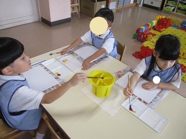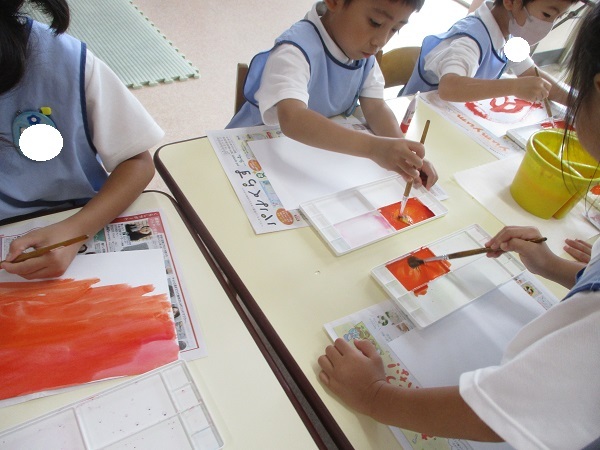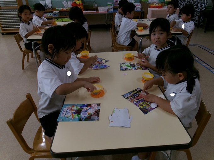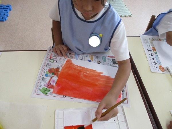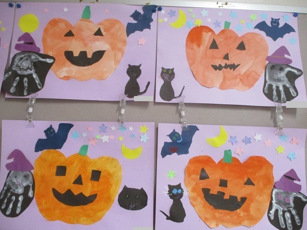 年中組は、ハロウィン制作をしました。 絵の具の赤色と黄色を混ぜて、橙色を作りました。 絵の具が混ざる様子を嬉しそうに眺める子どもたち。 一人ひとり素敵な橙色のジャックオランタンができて満足そうでした。 ハロウィンの絵本を読んだり、今からハロウィンを楽しみにしているようです♬ | ||
