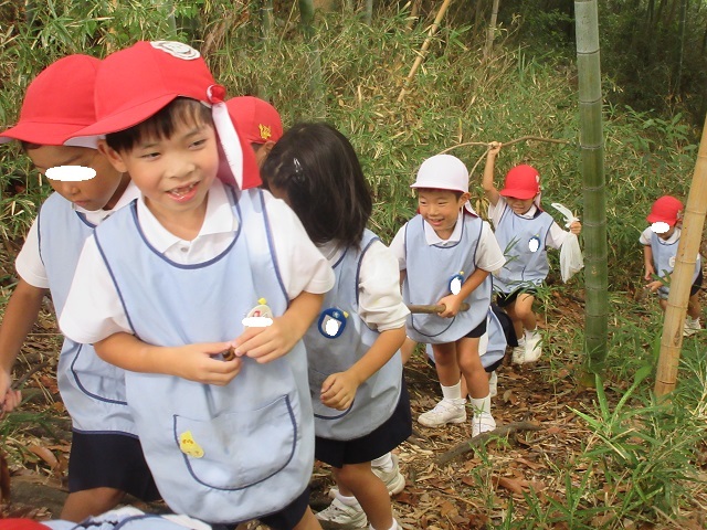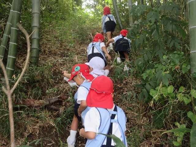 山の中にも入って、探検開始。「みんなで探検だ~!お~っ!」と声をかけあいながら竹藪に入っていきました。途中滑って制服が泥だらけになってしまいましたが、たくさんの笑顔がみられ嬉しく思いました💖鬼ごっこもたくさんして、ゆりぐみの楽しい時間を過ごせました。 | ||