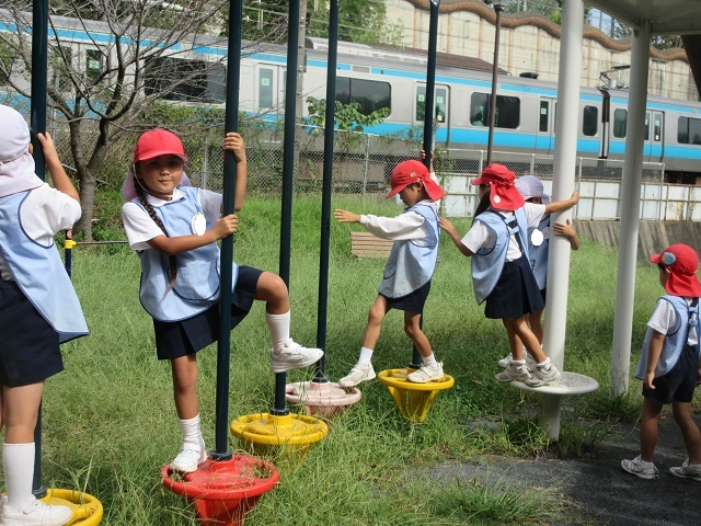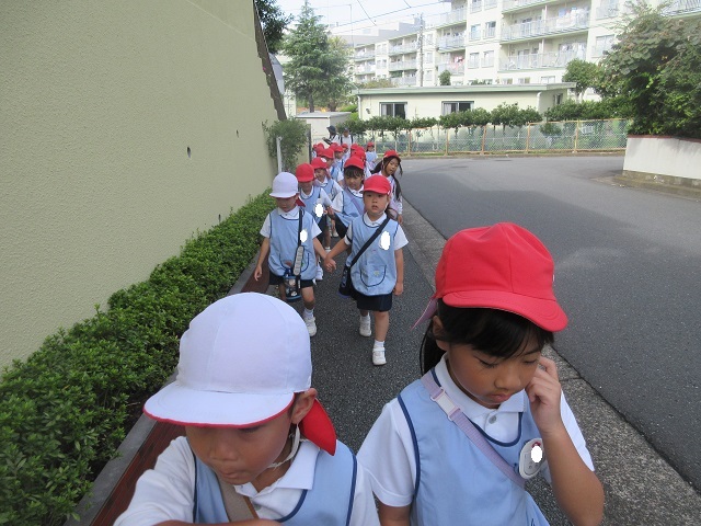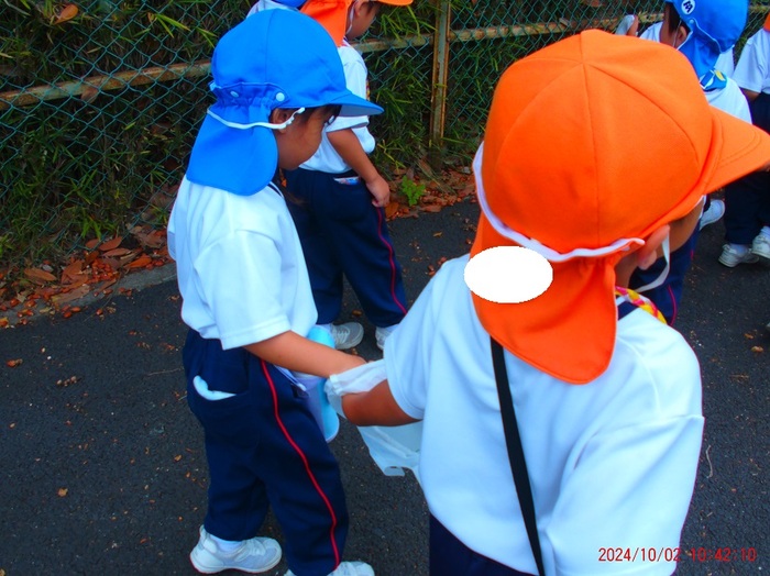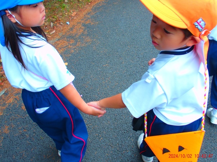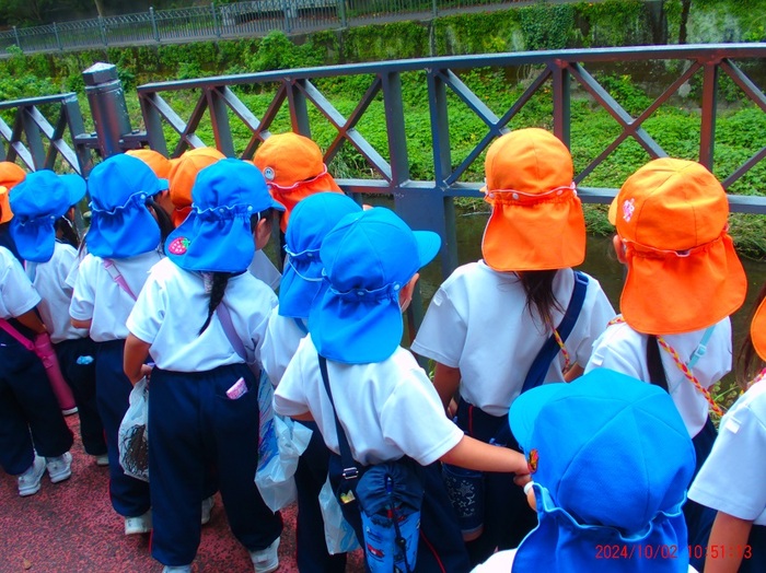 2025/10/3 今日は、年中組、年少組で一緒に幼稚園の近くをお散歩しました♪ 年中さんがしっかりと手をつないでお散歩してくれたので、年少さんも安心でしたね♡ いたち川では鴨や鯉を見つけて大興奮でした! | ||