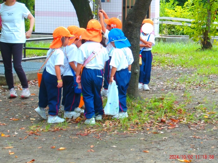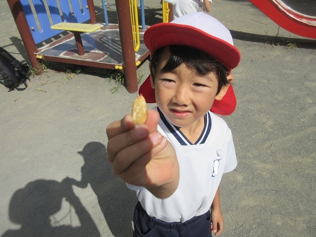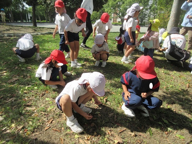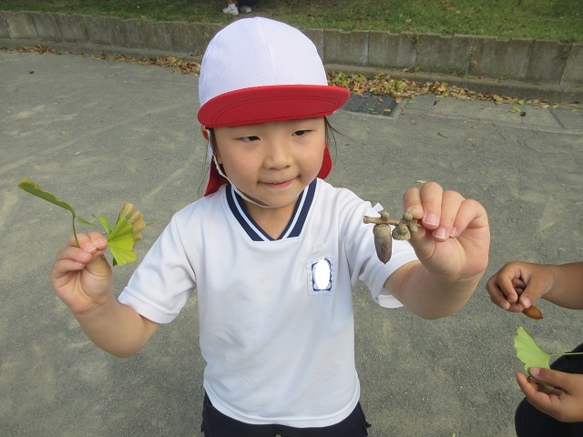 かけっこのあと、秋を探しに年長組は本郷台公園にいきました。どんぐりを拾いながら「これは大きいね。今度は小さいのを探す競争しよう。」とかなり長い時間楽しんでいました♬銀杏の葉っぱが少しずつ色づいていて、銀杏の実の独特な香りをかいで「くさーい(笑)」と笑いあいながら、五感を使って秋を感じることができました。 | ||