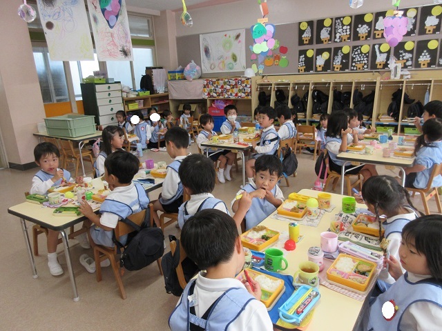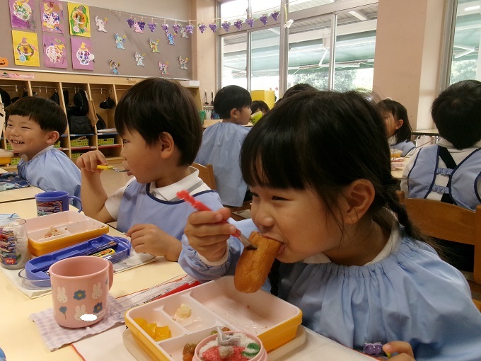 姫ゆりぐみのお兄さんお姉さんと一緒に給食を食べました。 ペロッと完食する姿を見て年少さんも残さず食べようと頑張っていました。 流石お兄さんお姉さん‼ | ||