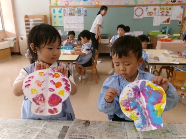 絵の具を使ってデカルコマニーを楽しみました! 今月もみんなの作った制作でお部屋が賑やかになりそうですね!(^^)! | ||