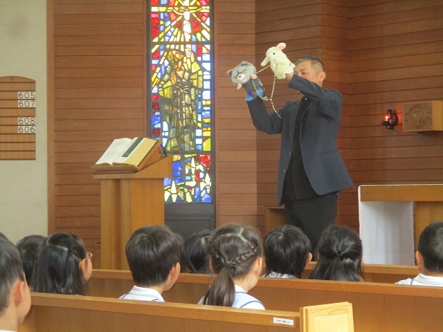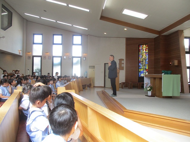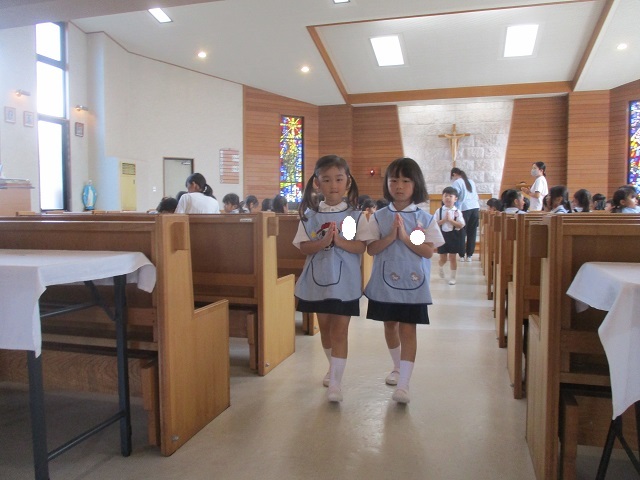 2025/10/8 幼稚園の隣にあるカトリック鍛冶ヶ谷教会で園長先生のお話をききました。 10月はロザリオの月です。ロザリオを使ってのお祈りの意味や周りの人のためにマリア様にお祈りをしましょうと教えていただきました。 | ||