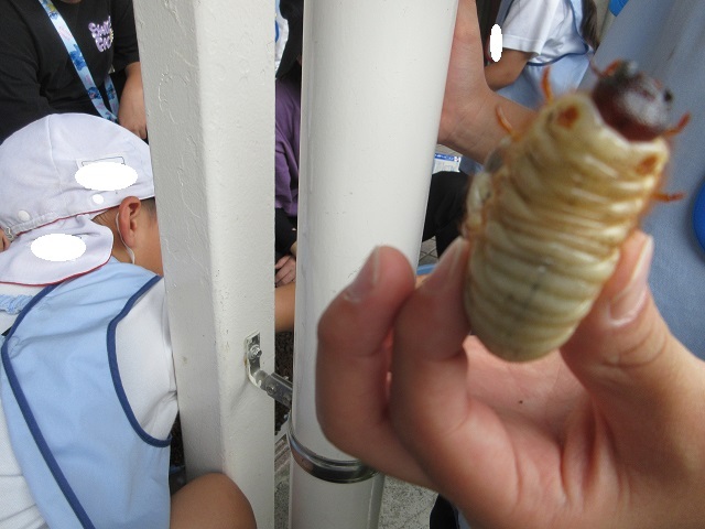 カブトムシの幼虫の成長を観察しました! 土をたくさん食べてウンチがいっぱい!新しい土に替えました。 大きさにビックリしていました! | ||