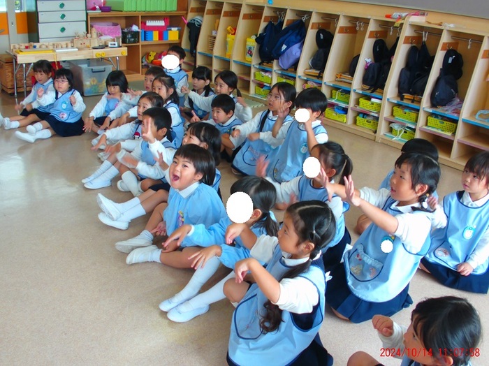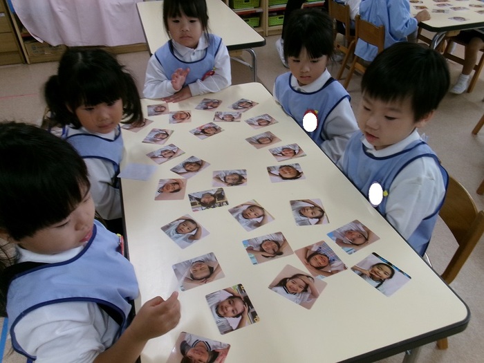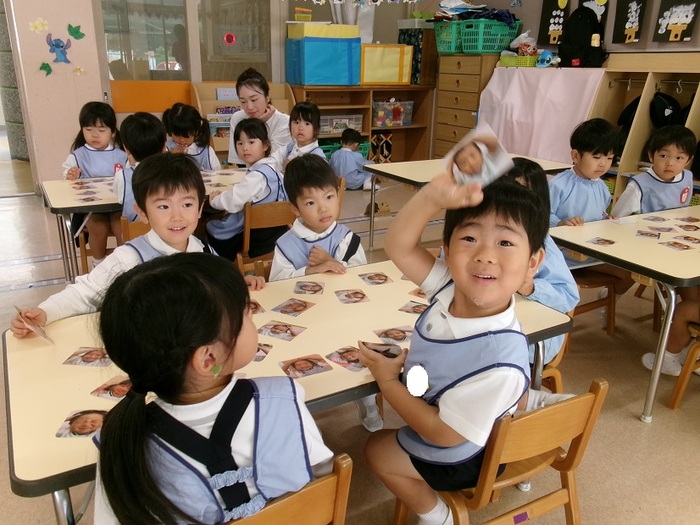 2025/10/15 年少組は、『お友だちの顔カルタ』で遊びました! お友だちの顔をよく見て、楽しそうにしている姿がとってもかわいかったです♪ | ||