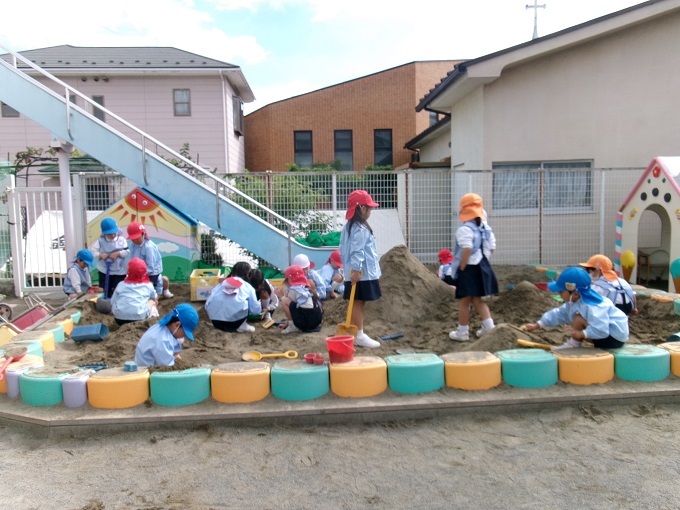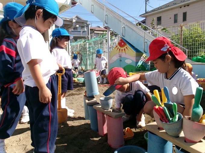 2025/10/17 今日は、久しぶりの良い天気‼ 子どもたちは戸外遊びを沢山楽しみました! 砂場では年長さんのカキ氷屋さんが開店。 早速、年少組さんがお客さんできてくれました。 「カップをこちらからお取りください」「お待ちくださ~い」お店屋さんになりきって接客する年長さん。 その姿を真似て年少組さんもお隣にお店屋さんを始めていました。 お兄さんお姉さんから遊びを通してたくさんのことを得ていますね。 | ||