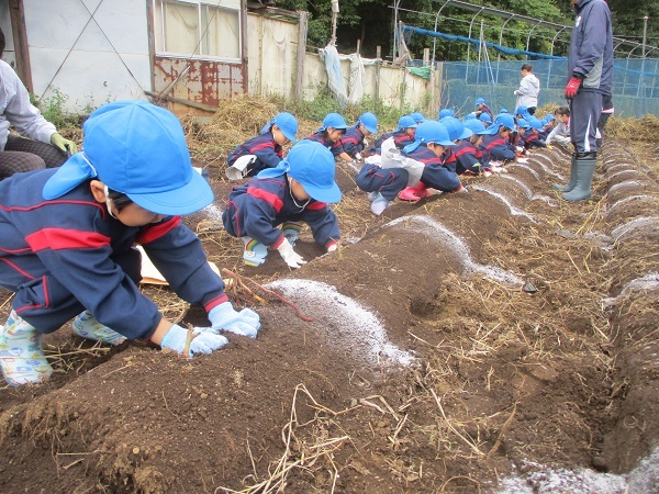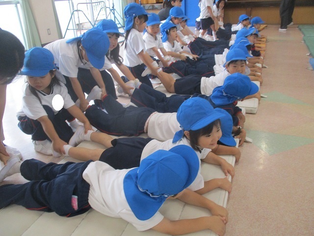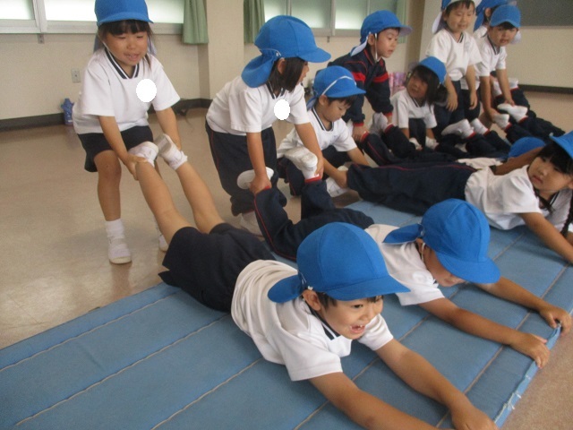 年少組の体操時間に、マット運動をしました。お芋ほりが近いのでお芋になってあそびました。 | ||