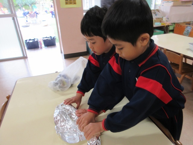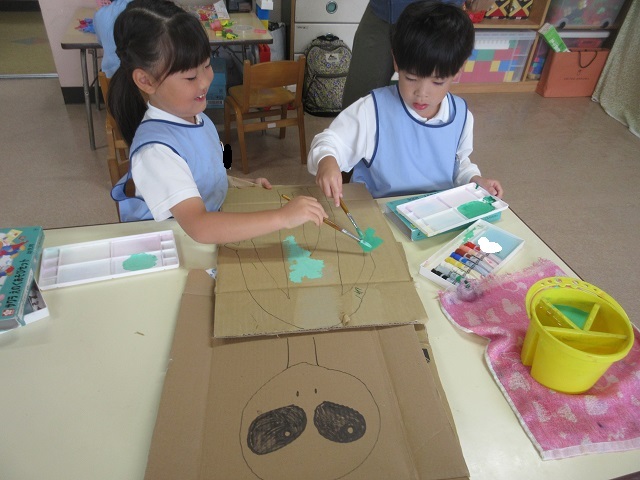 もうすぐハロウィンなので年長組のお部屋ではおばけづくり。宇宙人👽の色を相談しながら絵の具を混ぜてベストな色を塗っていました。久しぶりのお外遊びでお砂場でケーキ作りをしたり、元気にドッジボールを楽しむ姿がみられました。寒くなってきましたが、元気に遊んで風邪菌を吹き飛ばしましょう。 | ||