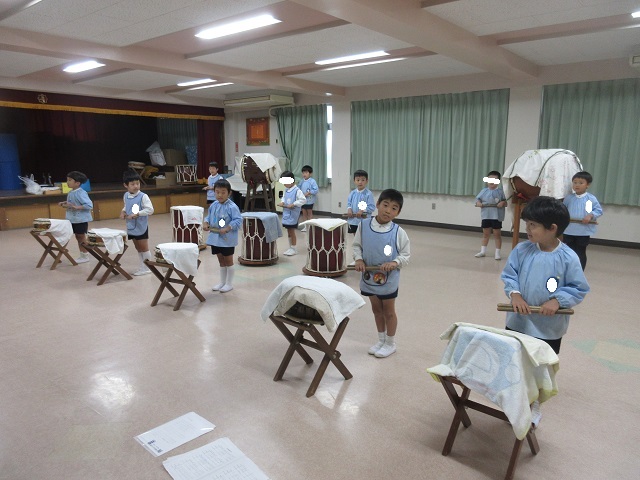 2025/10/23 年長組は、クリスマス音楽会に向けて和太鼓の練習が始まりました。構えやあいさつ等、基本的な動作を頑張っています。みんな凛々しく本番が楽しみです♬ | ||