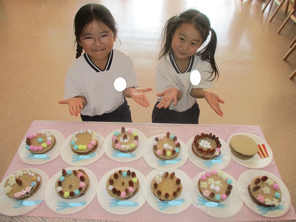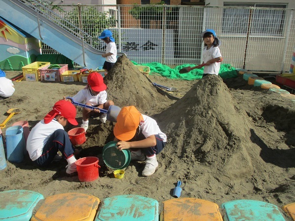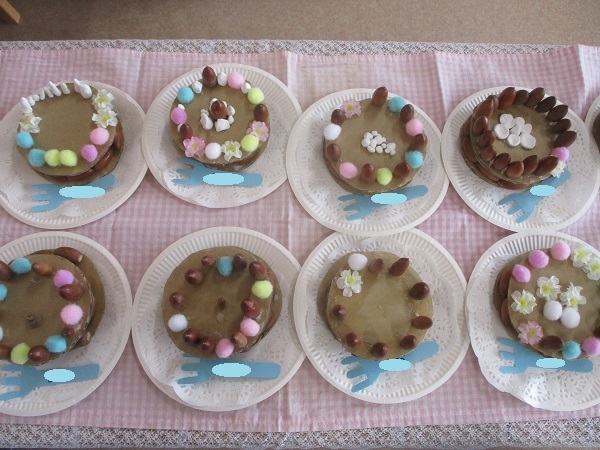砂場では、高くて大きなお山が二つ並んでいました!! みんなで協力してスコップで砂を運び、一生懸命積み上げていました。 どこまで高くなるか楽しみです☺ 年中組は、先日お散歩で拾ったどんぐりで“どんぐりケーキ”を作りました🎂 「おいしそうでたべたくなっちゃう~!!」と満足そうでした☺ | ||