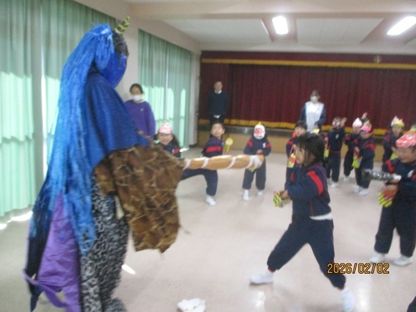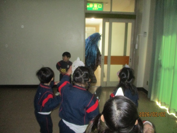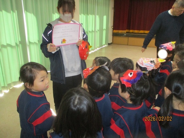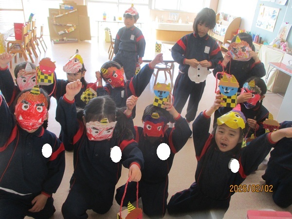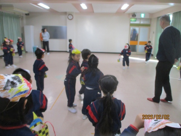 2026/2/2 明日は節分ですね👹 幼稚園では、今日豆まきをしました!! 今日のために鬼のお面や豆入れを作り、そして鬼を追い払う心の準備もしてきました。 豆まきの直前も大きな声で「鬼は外~福は内~」と意気込んでいましたが・・・ いざ、鬼を目の前にするとみんな後ずさりして声も小さくなっていましたが 頑張って豆をまくことができました。 鬼が置いていったお手紙を真剣に読んでいた子どもたち。 鬼を追い払うことができ嬉しそうでした。 | ||