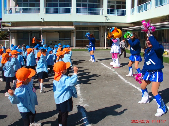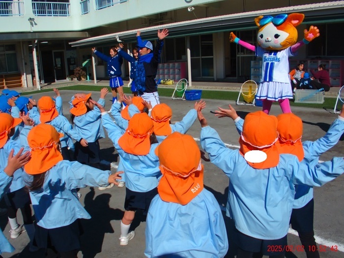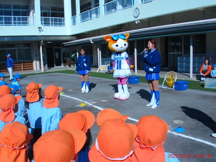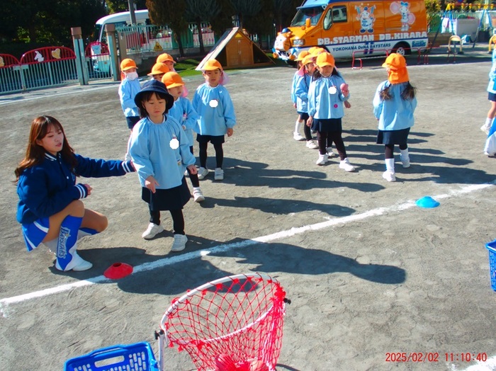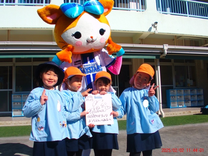 年中組・年少組の子どもたちは、ベイスターズの皆さんと一緒にダンスをしたり、野球について教えてもらいました! チアの皆さんやキララちゃんと一緒にダンスを踊る子どもたち・・・ とってもかわいかったです♡ 年中組はボールの投げ方や、バットの振り方を教えてもらい、野球の面白さを体験することができました! | ||
