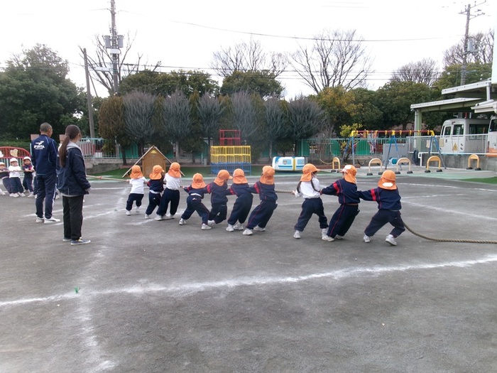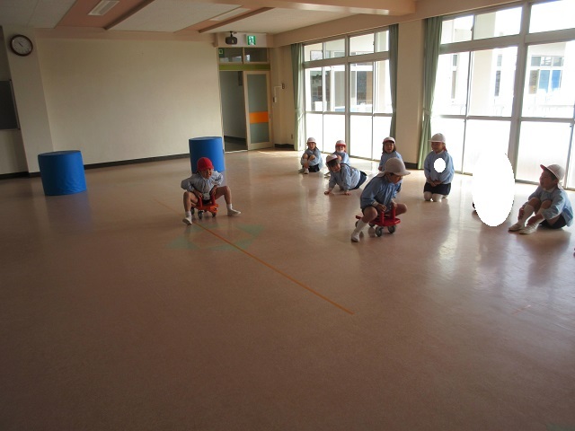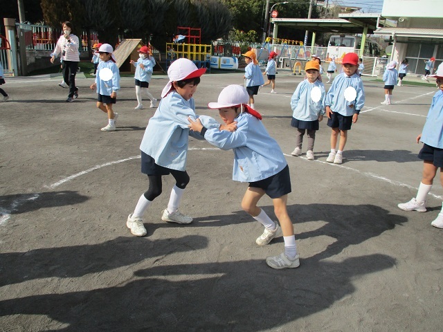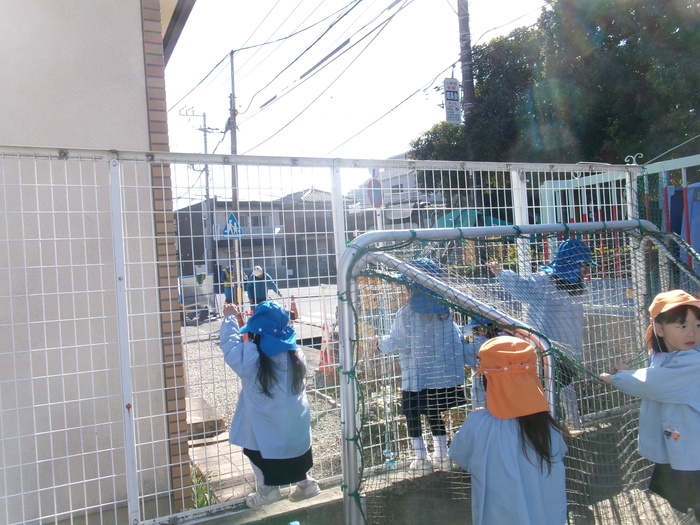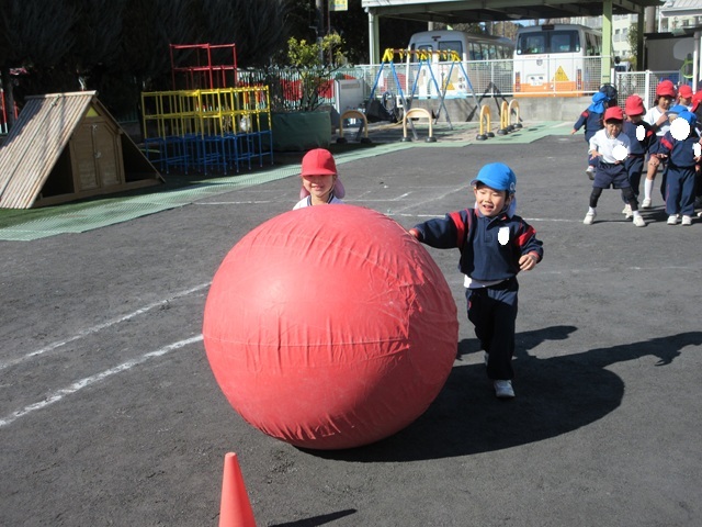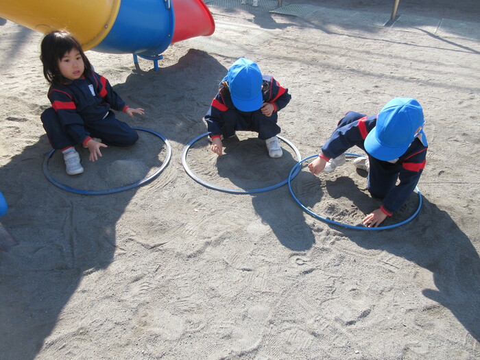 「ありがとう」「ごめんね」とお友だちと遊びの中で学んでいます。 今日も戸外遊びをたっぷり楽しみました。 | ||