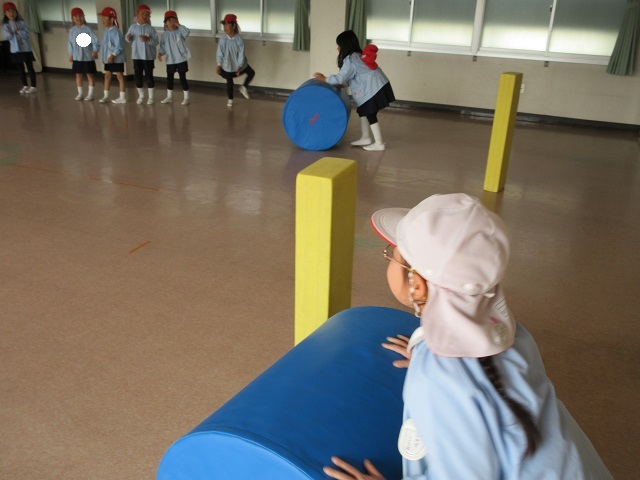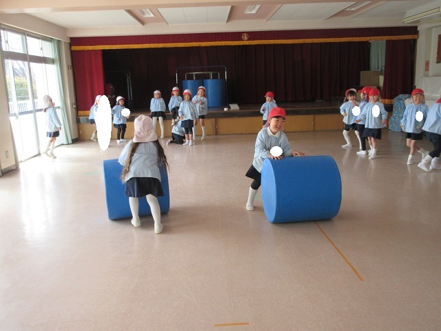 年長組が大きなブロックを使い、ゲームをして遊びました。 | ||