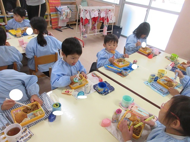 年長さんと年少さんが一緒に給食をいただきました。お世話をしながらやさしい言葉をかけてくれた年長さん、ありがとう♡ | ||