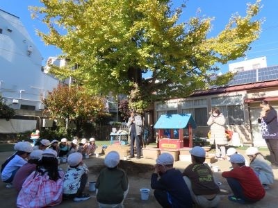 冬の訪れと共ともに、幼稚園のお庭にある大きなイチョウが黄色の葉を落とし始めました。寒い寒い冬ですが、要町幼稚園にはこの季節ならではのお楽しみもたくさんあります♪ | ||