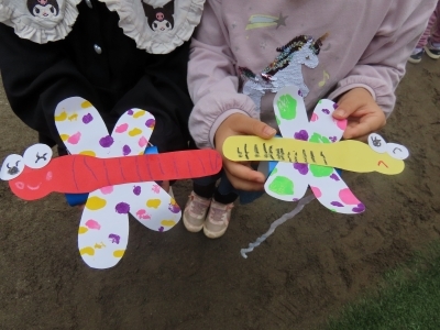 秋は、園庭あそびにもぴったりの季節です。この日は、年中組さんが元気いっぱいに園庭を走り、せいさくで作ったカラフルな「とんぼ」を飛ばして楽しんでいました。 | ||
