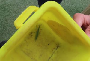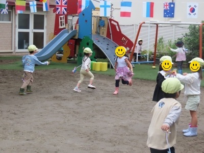 園庭の片隅では、年長組さんが「ショウリョウバッタ」を発見!大興奮で観察した後は、名残を惜しみつつも、お庭に戻してあげることに決めました。 | ||