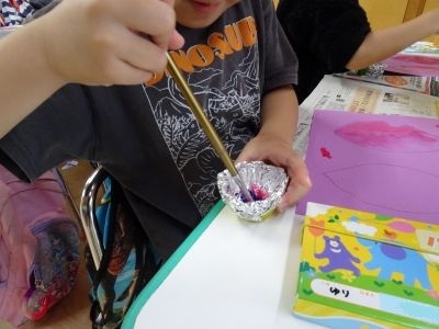 教室の中では、年長組さんが2色の絵の具を使って何かを描いています。どこかで見覚えのある、この色と形の正体は… | ||