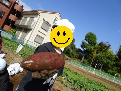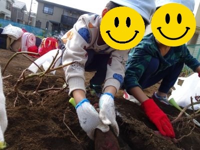 じゃじゃーん!秋の味覚の「さつまいも」でした!幼稚園では毎年秋になると、年中・長さんがお芋ほり遠足に出かけます。絵の具で描いたお芋と、実際に収穫したお芋、どちらが大きかったかな?お天気にも恵まれ、とても楽しい遠足となりました。 | ||