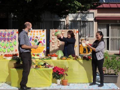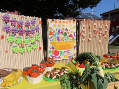 園庭には本物のお野菜や果物、子ども達が作った作品が飾られました。中には、日ごろあまり目にしない珍しいお野菜や果物も。英語の先生がいらしていたので、お野菜・果物の英語での呼び方も教えていただきました。 | ||