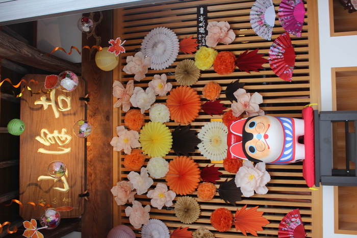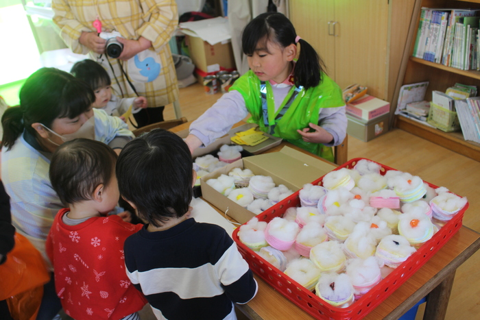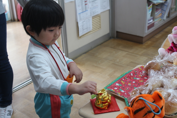 魚釣りの金魚は、年長さんが折り紙で作ってくれました。お土産で2個もらえるのも嬉しいね! | ||