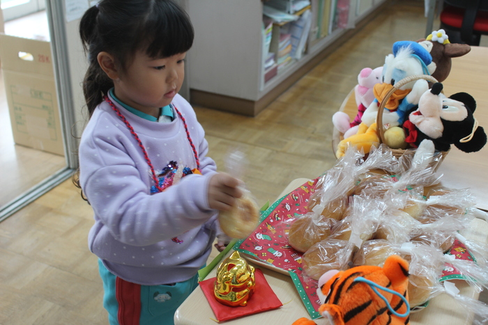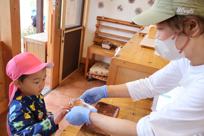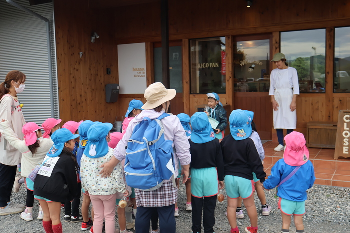 パン屋さんの中はとてもいい匂いです。「パン下さい」「ありがとう」上手にお買い物ができました。 リコパンさん、貴重な体験をさせて頂きありがとうございました。 保育園の職員室では、リコパンさんのパンを年少さんたちが買いに来ました。 | ||