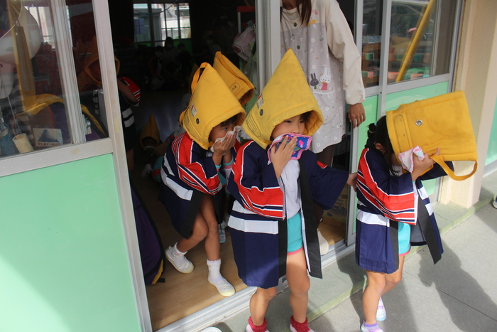 お昼は、非常食のα米、カレー、フルーツミックス缶を食べました。 午後には、園から保護者にメールが出て引き渡し訓練も行われました。 | ||