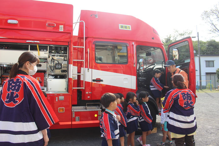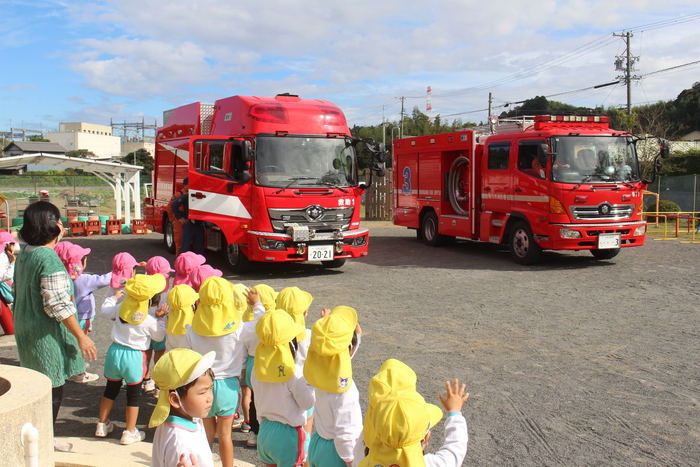 9月16日(火) 消防署見学(年長・年中) 市バスに乗って、消防署見学に行きました。 「消防署は何をするところかな? 何があるのかな? 将来なりたいな~と思ってくれたらいいな」とお話がありました。 施設内を見学したり、消防車の説明を聞いたり、訓練の様子を見せてもらいました。 | ||