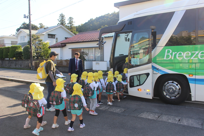「おおきいね~」「ごうかだね~」「のりたいな~」みんな興味津々で窓から中をのぞいていました。 「いってらっつしゃーい」お見送りも大きな声でできました。 | ||