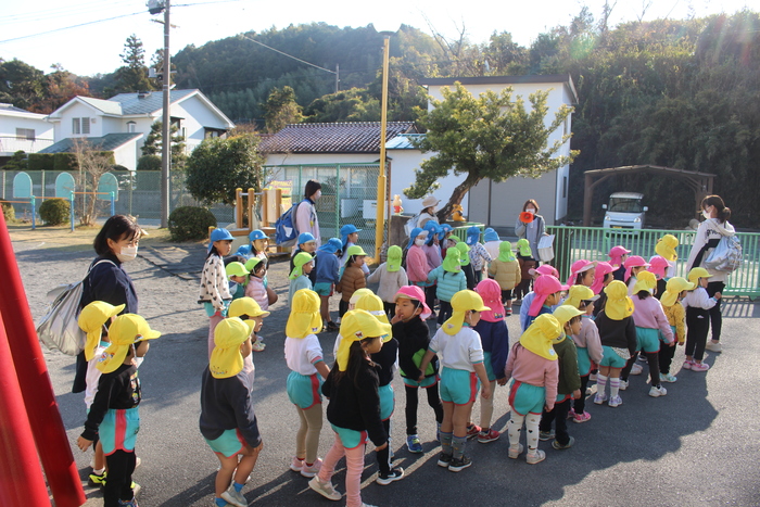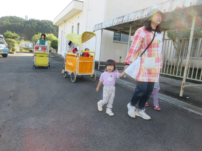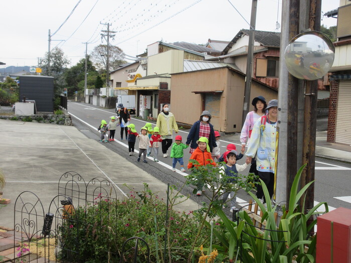 未満児クラスは保育園の近くをのんびりお散歩。 | ||