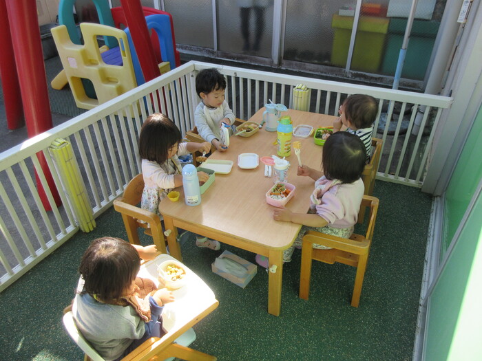 4月4日(金) 青空ランチ 年長・年中さんがベランダに机を出して青空ランチを楽しみました。 今日のメニューはみんな大好き「ハヤシライス」 お散歩でたくさん歩いたのでお腹はペコペコです! 先日植えた、サニーレタスも収穫して食べました。 | ||