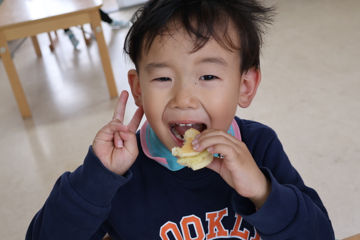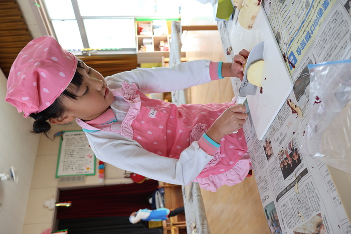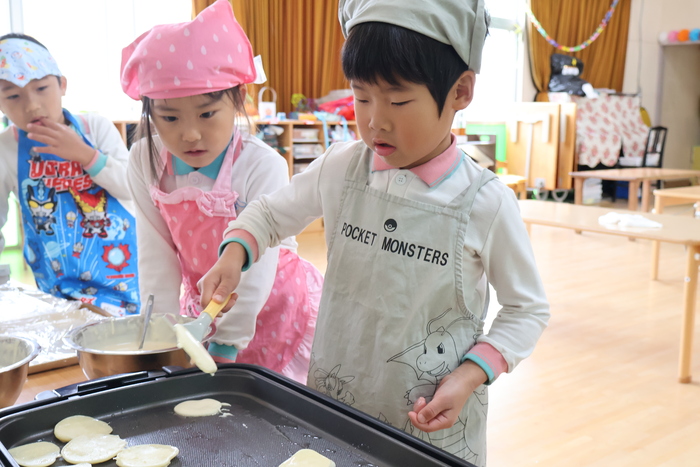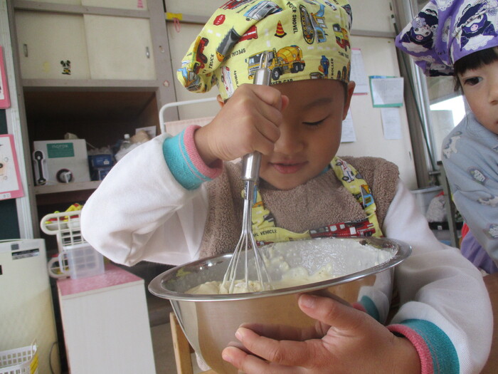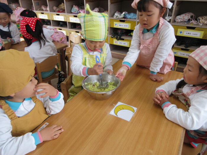 11月12日(水) クッキング(年長・年中・年少) それぞれのクラスで役割分担をして『さつまいも餡のどら焼き』を作りました。 | ||