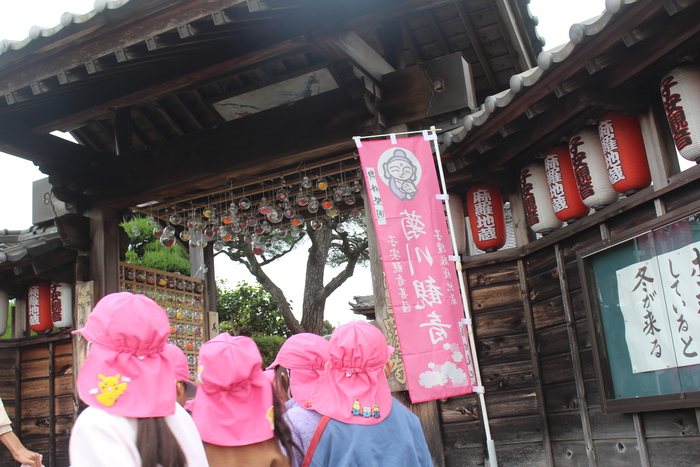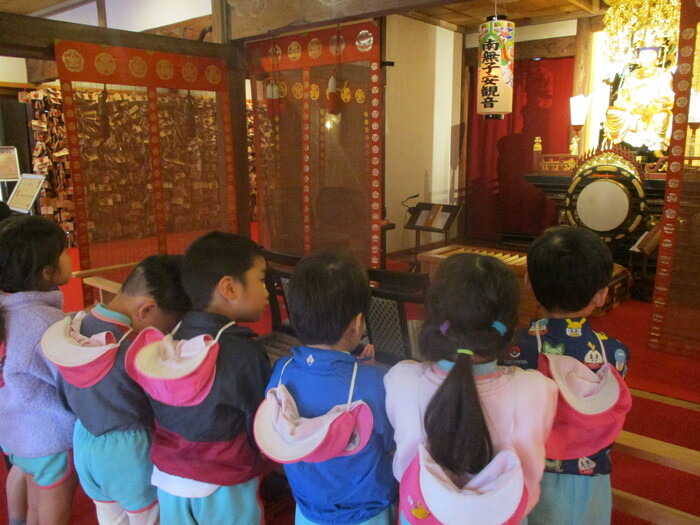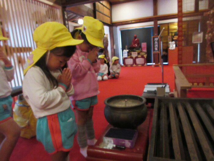 4月8日(火) 花まつり 年長・年中さんが善福寺で行われる花まつりに参加させていただきました。 和尚様から「花まつりはお釈迦様の誕生日です。生まれた日に甘い雨が降ったので、甘茶をかけてお祝いしましょう 」とお話があり、お経をあげてから、順番にお参りしました。 | ||