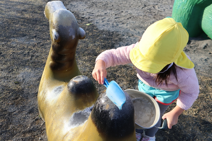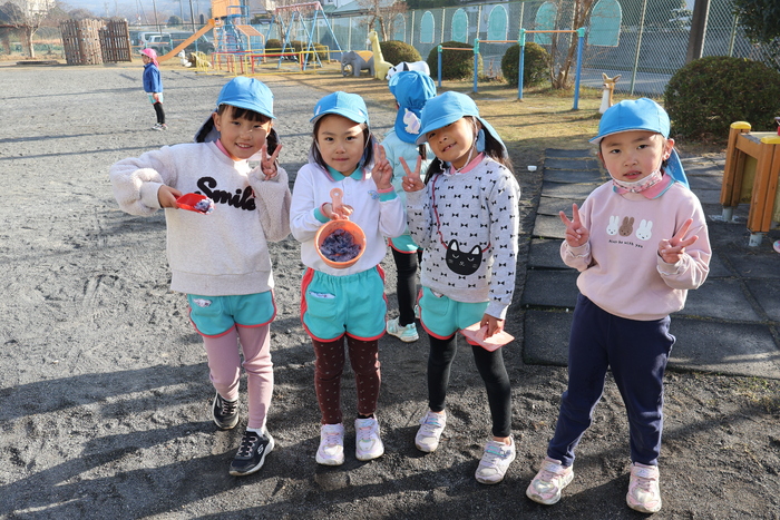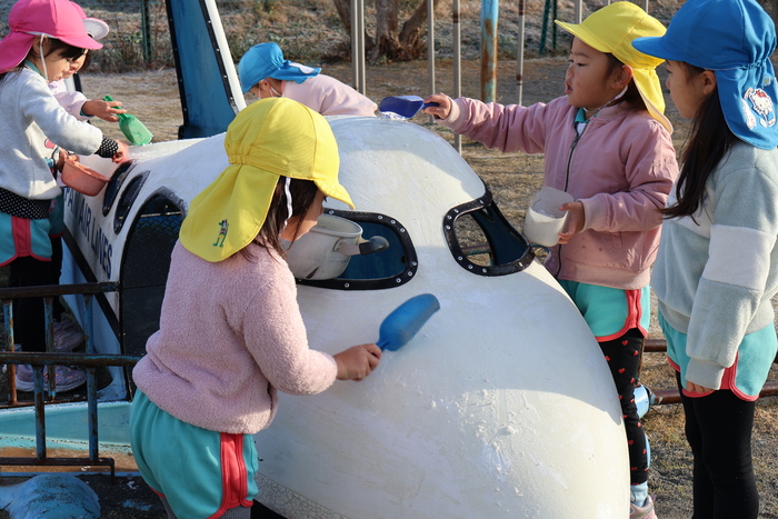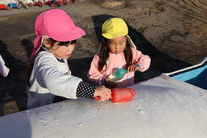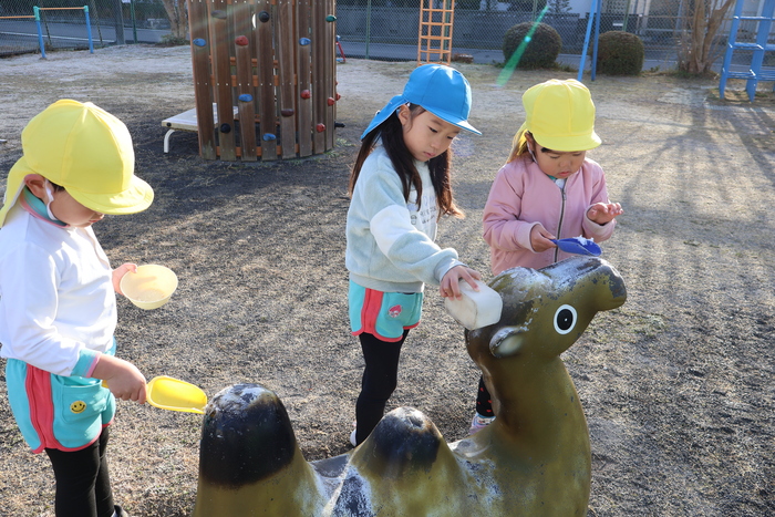 12月10日(水) 寒い朝 園庭の遊具に白くてキラキラしたものが・・・ 「さぁ~むぅ~いー!」 と言っていたこども達の目がキラリーン✨ シャベルと容器を持って来て、かき集めます 年齢関係なく、協力し教え合い、たくさん集めました これが『学び』です | ||