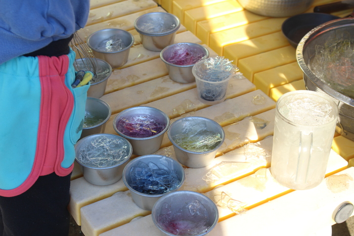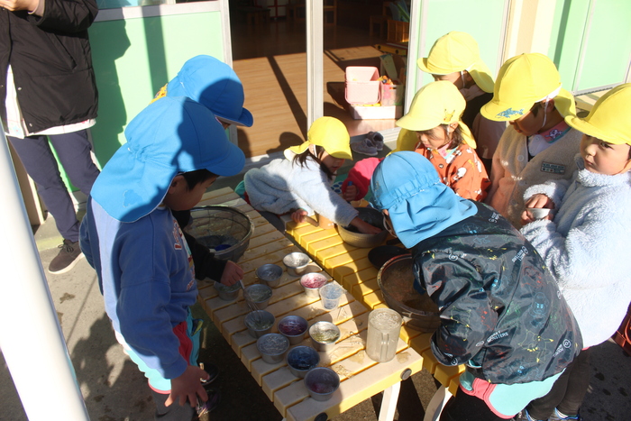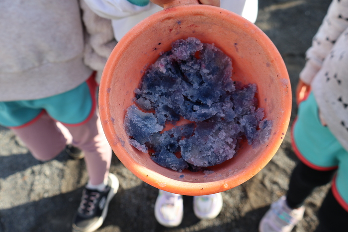 集めた『雪』(こども達にとっては😊)に食紅を混ぜたら・・・ 「みてぇ!」 きれいな色になって「たべたくなっちゃう!」 美味しそう! | ||