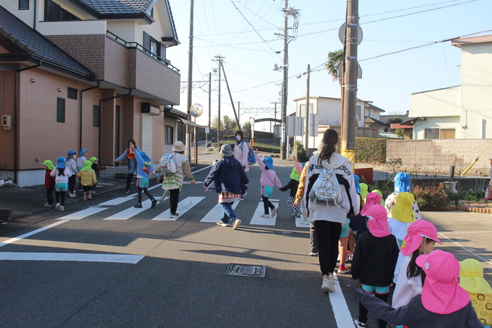 年中・年少さんは園庭に横断歩道を書いて渡る練習。年長さんは実際に道路を歩いて、安全を確かめながら歩く練習をしました。 みんなルールを守りしっかり歩くことができましたよ。 | ||