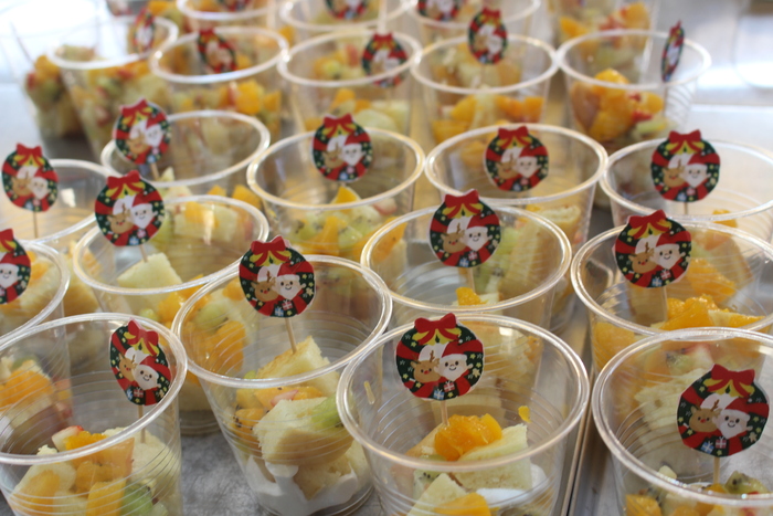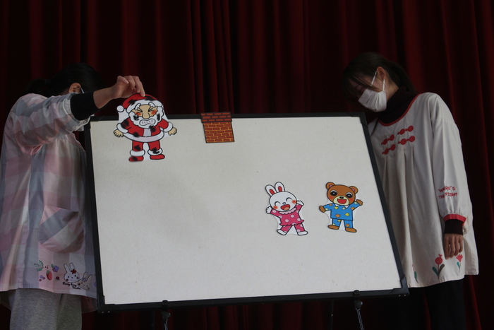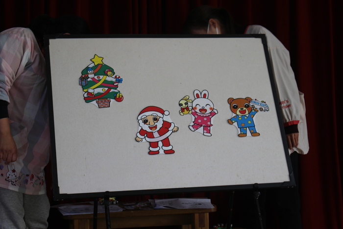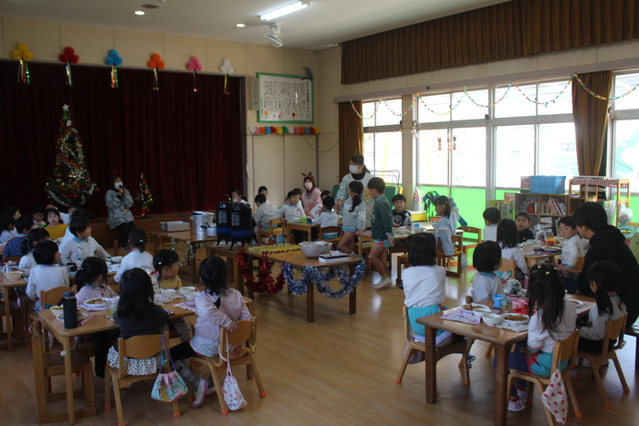 12月23日(火) クリスマス会☆クリスマスランチ 全員で『あわてんぼうのサンタクロース』の合奏をして、クリスマス会の始まりです♪ 先生方がパネルシアターもやってくれました。 | ||