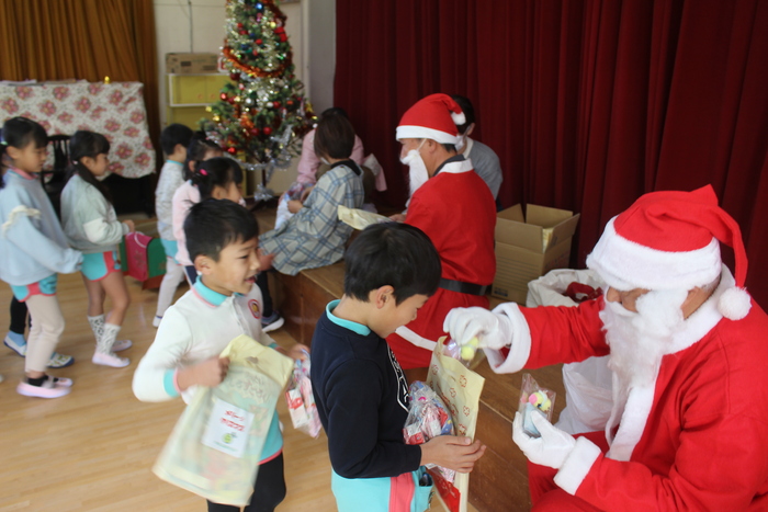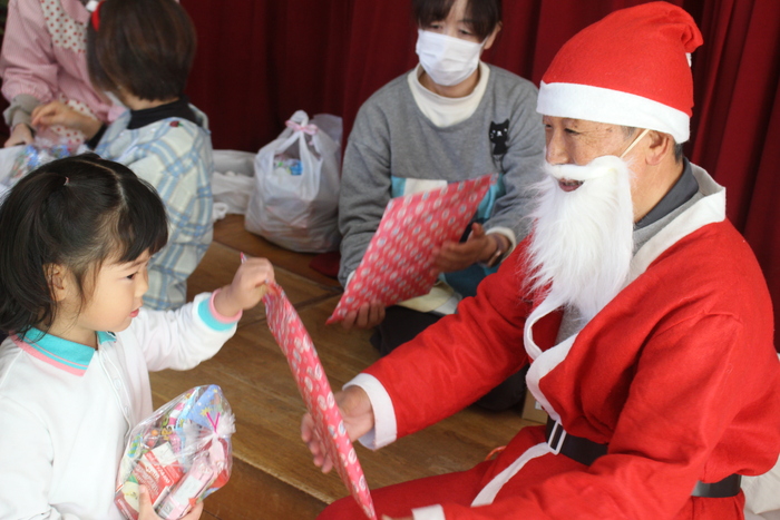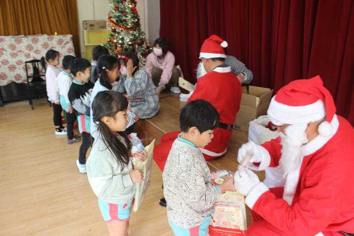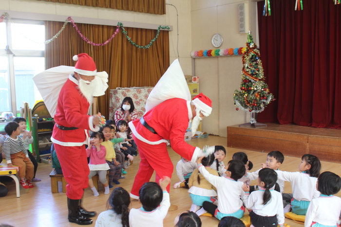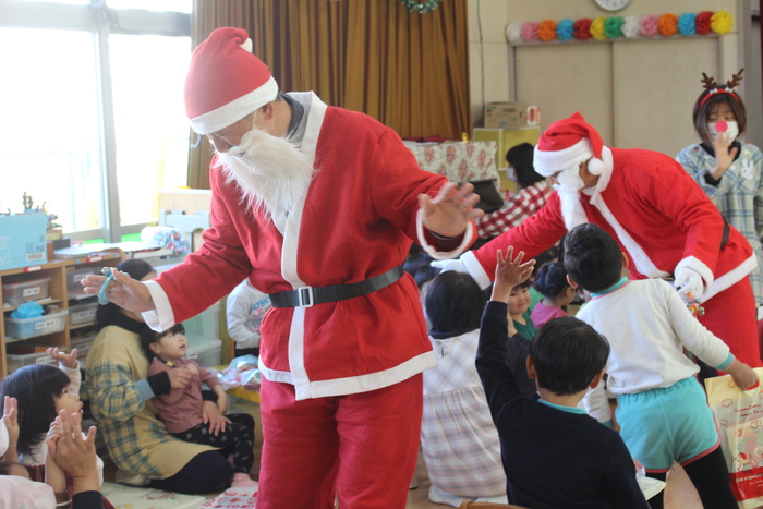 シャンシャン…と鈴の音と一緒にサンタさん登場!今年は2人のサンタさんとトナカイさんもやってきてくれました。持ちきれないほどのプレゼントをもらい、みんなニコニコです。 | ||